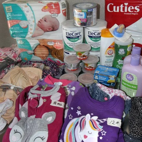 Infant and toddler needs, such as food, formula, diapers, wipes, new & gently used clothing, and new handmade quilts.